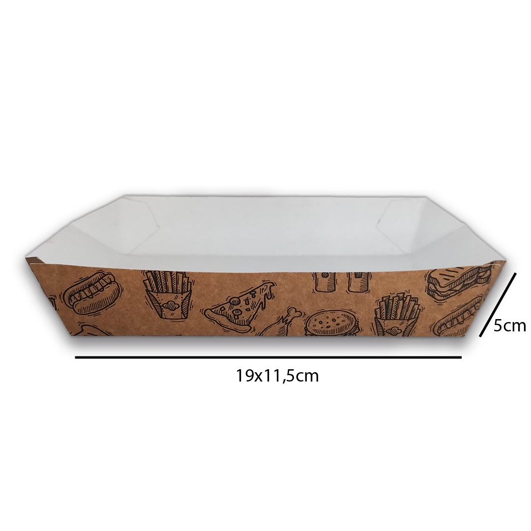 A Embalagem Bandeja 02 possui um formato inovador e prático, ideal para comportar fritas, mini salgados e porções.