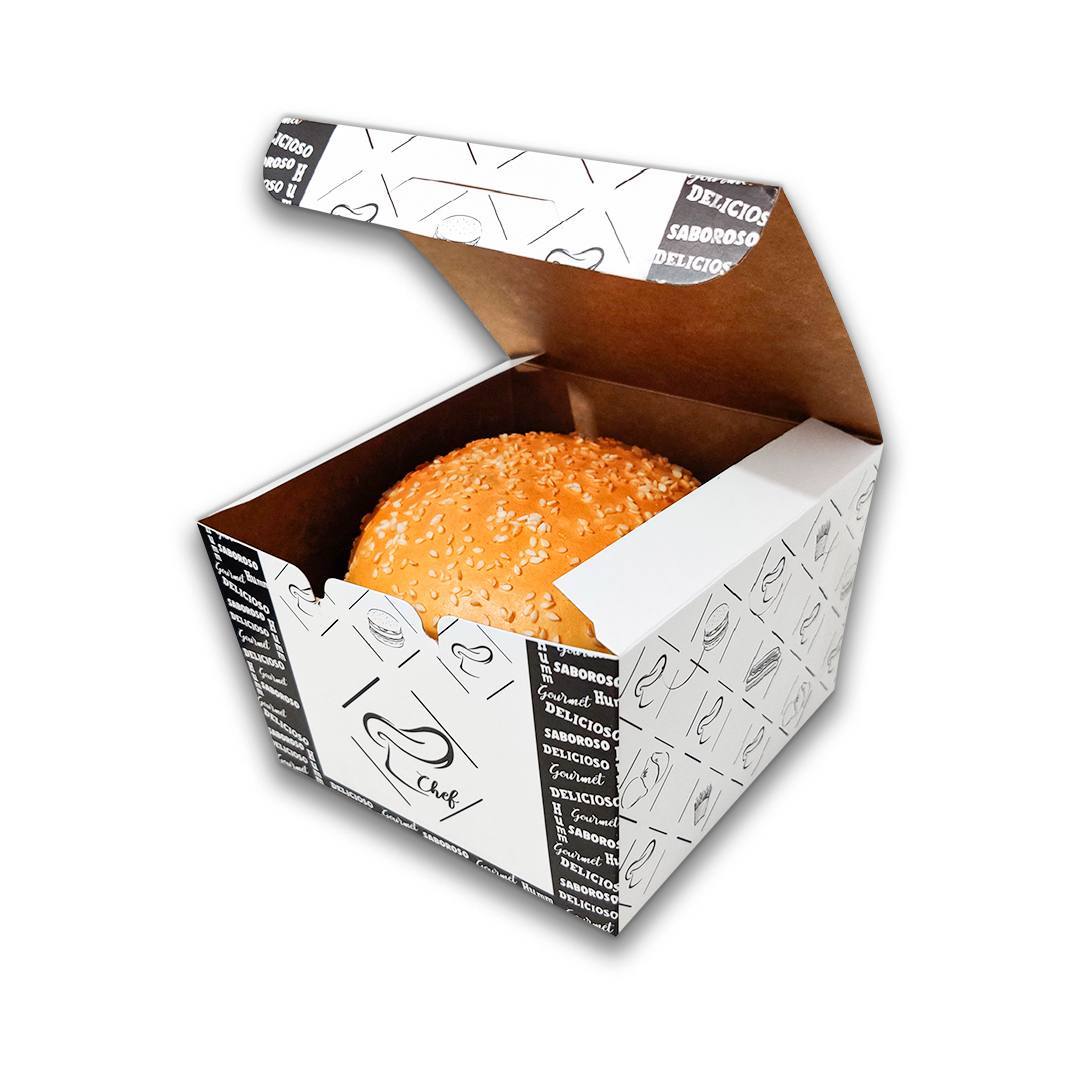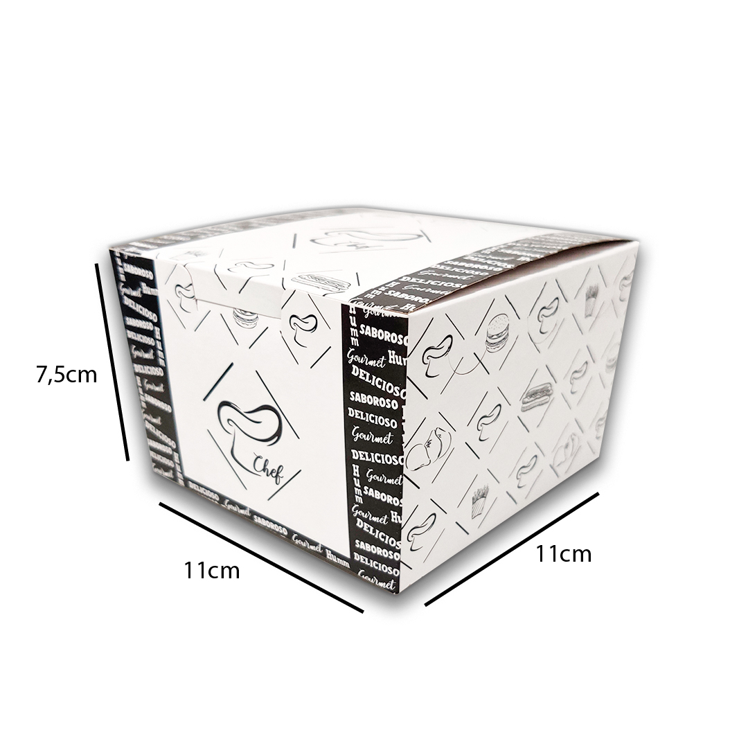 A Embalagem Caixa h03 Mini possui um formato prático e inovador, ideal para hambúrgueres, mini salgados e porções.