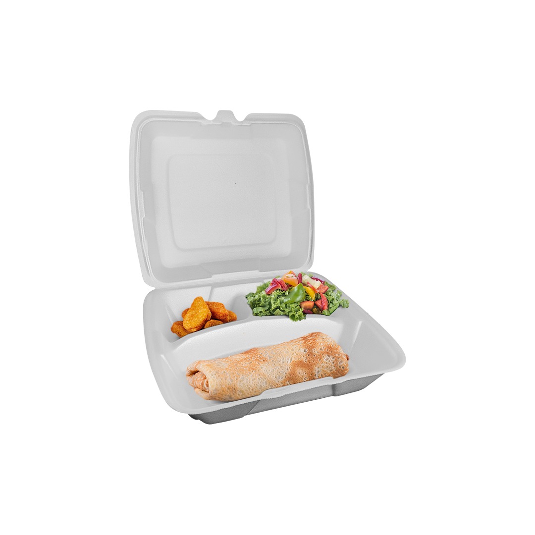 Conteúdo do Envio: 1 pacote de Marmita Retangular de Isopor (com 3 Divisórias) – 21 x 18 x 8 cm – 100 Unidades;